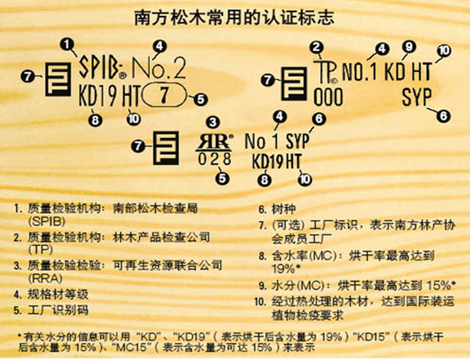 每塊南方松木材上都蓋有認(rèn)證章,可確保買方收到的產(chǎn)品是其指定的產(chǎn)品。等級標(biāo)記上標(biāo)明負(fù)責(zé)檢查的機(jī)構(gòu)(SPIB/TP/RRA或其他機(jī)構(gòu)**),同時(shí)標(biāo)出木材等級、含水率以及生產(chǎn)商的木材加工廠編號。SFPA成員可以將協(xié)會的徽標(biāo)包括在等級標(biāo)記中,但標(biāo)記中并非一定要有協(xié)會的徽標(biāo)。